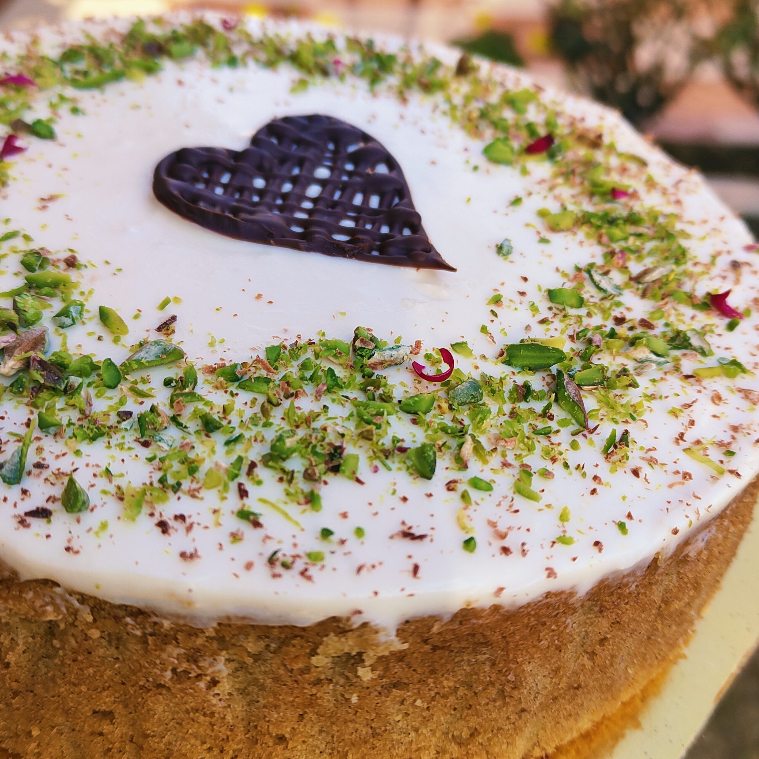 Indulge in a luxurious delight, crafted from pure and natural ingredients, moist whole grain elaichi & rose flavoured sponge, topped up with a zesty creamcheese ganache (homemade), green pistachios, and rose petals.
